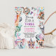Colorful safari themed young, wild and three birthday invitation for girl featuring various jungle animals, bunting flag, balloons, party hats and foliage. All text is editable making the template suitable for any age.