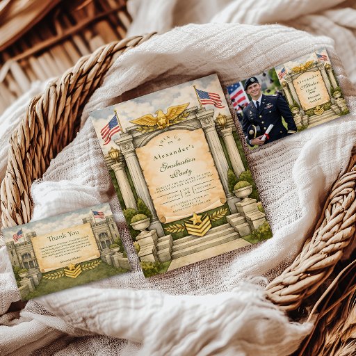 Celebrate a major milestone with this vintage-inspired patriotic graduation design. Featuring classic military-style insignias, laurel wreaths, banners, and a timeless parchment center, this invitation is perfect for honoring a graduate with strength, pride, and tradition. Ideal for formal or themed graduation celebrations with a bold, heritage-inspired aesthetic.