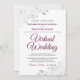 Ce n'est pas parce que vous avez été forcé de déplacer votre mariage vers une cérémonie virtuelle que vous ne pouvez pas envoyer de belles invitations. Cet élégant invitation présente un élégant cassis mauve ou magenta et des lettres grises sur un arrière - plan blanc avec un faux fil argenté en dentelle florale ou des boucles et tourbillons dans les coins. Un moyen parfait d'invitation vos amis et votre famille pour partager votre journée spéciale, même s'ils ne peuvent pas être là en personne.