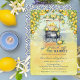 Belle ferme en fer noir citrons style méditerranéen "Fresh Off The Market" design Fête des mariées. Un arrière - plan rustique à l'aspect vieilli combiné avec des boughs au citron, des citrons et un stand en bois évoque un marché italien en plein air, méditerranéen ou champêtre. Le dos est orné d'un beau motif méditerranéen bleu, blanc et jaune.