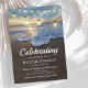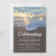 Invitations funéraires avec une côte côtière, un coucher de soleil magnifique, des lampes à cordes et une célébration moderne de la vie modèle qui est facile à personnaliser.