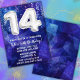 Garçon bleu blanc 14e anniversaire invitation garçons 14 anniversaire invitation pour un garçon bleu violet avec écriture de script moderne et des ballons de papier amusant.