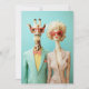 Une image surréaliste de style pop-art avec une girafe et une femme glamour habillée en tenues élégantes d'inspiration vintage. Les deux portent des lunettes de soleil rouges surdimensionnées, dégageant un charme suranné face à un arrière - plan pastel turquoise.