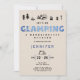 Un modèle d'invitation de week-end bachelorette moderne, élégant et chic avec un thème campant et denim et diamants, avec des denim et strass sur le titre "camping" (c'est un effet numérique, pas de vrais strass !), des icônes de camping dessinées à la main et en plein air (camp de feu, marshmallows, tente, lampe, etc.) à la texture moderne et désespérée. Un choix agréable et amusant pour un week-end de bachelorette glam de camping amusant, randonnée ou n'importe où en plein air.
