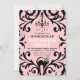 Ce design fantaisiste présente un cadre noir ornemental damassé avec un chat éffrayant, des chauves-souris et une araignée déplaisante. Un lustre suspendu au sommet donne l'ambiance à cette élégante invitation à la fête. Le dos a un motif damassé noir coordonné qui est orné d'araignées.