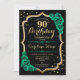 Invitation de fête du 90e anniversaire. Design vert émeraude floral élégant avec de l'or de parties scintillant, des roses et des caractères de script. Idéal pour une célébration anniversaire féminine élégante. Peut être customisé pour n'importe quel âge ! Invitations Zazzle imprimées ou téléchargement instantané modèle imprimable numérique.