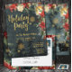 Un invitation de vacances classe et élégant avec un arrière - plan de soirée boisé aquarelle avec des bouquets de fleurs rouges de vacances et une végétation à feuillage persistant avec une calligraphie dorée chatoyante et un parfum de délicats flocons de neige, invitant vos invités à votre fête de vacances. Le dos de la carte sert de carte de Joyeux Fêtes.