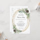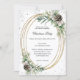 Un arrière - plan blanc. Un cadre ovale en faux or décoré de cônes, de berres blanches et de végétation en pin. Faux parties scintillant argent, étincelle. Personnalisez et ajoutez les détails. Texte noir. Code QR à votre site pour RSVP et détails de fête.