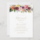 Cette invitation à la retraite tropicale boho en plumes d'or est parfaite pour un événement moderne. Le design se compose de plumes sauvages brunes peintes à la main, jaune sauce, blanc, violet, rose, rousse, bordeaux et baies bleues soigneusement disposées en de beaux bouquets.