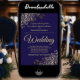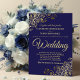 Cette invitation de mariage simple mais élégante comporte des lettres en or sur un arrière - plan bleu marine. Le design est sobre, mais les coins sont ornés d'un faux fil floral doré orné de boucles et de frites. Le texte est formel et traditionnel mais le design chic rend cette invitation appropriée pour tout mariage.