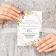 Ce faire-part de mariage espagnol à fleurs géométriques dorées et fleuris est parfait pour un mariage simple. Le design présente des peintures à la main de belles pivoines roses, rousses et jaunes au feuillage vert, ornant un cadre géométrique doré.