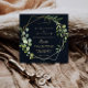 Cette faire-part de mariage dorée vert-bleu est parfaite pour un mariage simple. Le design présente de beaux feuilles verts peints à la main dans un arrière - plan bleu foncé, ornant un cadre géométrique doré.