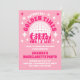 Cette invitation à la fête de Bachelorette rose présente une boule de disco et une typographie rétro, ce qui lui donne une ambiance amusante et ludique. Le devant de l'invitation est orné d'un arrière - plan rose et d'une discothèque étincelante, d'étoiles, de danseuses qui donnent le ton pour une fête animée et énergique. La typographie rétro ajoute au thème, donnant à l'invitation une ambiance nostalgique chic. Sur le dos de l'invitation, photo personnalisée de la mariée ajoutant une touche personnelle au design.