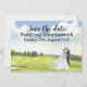 Notre carte d'invitation de mariage présente une belle peinture à l'aquarelle d'un terrain de golf. La carte Enregistrer la date est le moyen idéal pour informer vos amis et votre famille de notre journée spéciale.