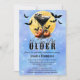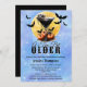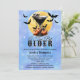 Éffrayant gothique A Tini Bit Anniversaire Invitation - Doté d'une boisson noire dans un verre à martini orné de crânes et de citrouilles oranges. Les chauves-souris noires volent et une lune jaune vif est dans l'arrière - plan. Un ciel bleu et violet étoilé, mystique et céleste est le décor de cette gothique, vibes sorcières invitation d'anniversaire. Tout le texte est modifiable. Disponible en téléchargement numérique instantané, parfait pour l'envoi par SMS, email ou médias sociaux.
