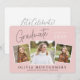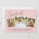 This modern graduation invitation showcases three photo spaces highlighting this year’s graduate. The design is accented with trendy, handwritten-style typography on the light dusty pink background. The back offers custom text to share all of your party details.