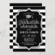 Invitation à la fête de fin d'études pour hommes ou femmes. Elégante carte invitation en noir, blanc et argent. Design simple et moderne avec des rayures, un casquette, faux parties scintillant argent et typographie script. Idéal pour une célébration élégante de remise des diplômes.