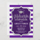Invitation à la fête de fin d'études pour hommes ou femmes. Elégante carte invitation en violet, blanc et argent. Design simple et moderne avec des rayures, un casquette, faux parties scintillant argent et typographie script. Idéal pour une célébration élégante de remise des diplômes. Invitations Zazzle imprimées ou téléchargement instantané modèle imprimable numérique.
