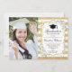 Invitation à la fête de remise des diplômes avec votre photo. Il est composé de rayures blanches d'or, de caractères de script, de roses blanches, de savelle et de confettis. Design élégant avec de l'or de parties scintillant imitation. Parfait pour une célébration élégante.