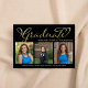 Ce design comprend une calligraphie de grade de diplômé, avec un collage multi-photo trois, un lycée ou collège, une police de script de calligraphie élégante, une typographie traditionnelle classique moderne, un minimaliste simple élégant, un thème de couleur de nom d'école, une simple invitation de remise de diplômes, une carte de faire-part de graduation, avec un texte de dégradé d'or et un arrière - plan noir simple
