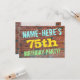 Ce design amusant d’invitation à la fête d’anniversaire comporte un message comme "NOM-HERE’S 75th BANTHDAY PARTY!", où le nom peut être personnalisé, sur le devant. L'arrière - plan est représenté par un mur en brique composé de briques de couleur rougeâtre. Le texte de message personnalisable sur le devant présente des couleurs comme le bleu, le jaune et le vert, et il a un aspect inspiré de celui des graffitis peints. Le verso comporte un message personnalisable qui pourrait inclure des détails pertinents sur la fête d'anniversaire. Des invitations à des fêtes d'anniversaire comme celle-ci pourraient être une façon amusante pour la famille et les amis invitations d'une fête d'anniversaire organisée pour quelqu'un qui célèbre son soixante-quinzième anniversaire. [~Z0000287]