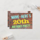Cette invitation pour une fête d'anniversaire amusante présente un message comme "FÊTE D'ANNIVERSAIRE DE 20 ANS DE NOM-À-INSÉRER !", où le nom peut être personnalisé, sur le devant. Le fond représente un mur de briques constitué de certaines briques de couleur brun-rouge. Le texte du message personnalisable sur le devant présente des couleurs comme le bleu, le jaune et le vert, et a une apparence inspirée par celle des graffitis peints. Le verso présente un message personnalisable qui pourrait inclure des détails pertinents sur la fête d'anniversaire. Les invitations de fête d'anniversaire comme celle-ci pourraient être un moyen amusant d'inviter la famille et les amis à une fête d'anniversaire organisée pour quelqu'un qui célèbre son vingtième anniversaire.
