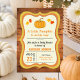 Invitation vos invités avec cette mignonne invitation de baby shower à thème automne avec un adorable petit citrouille avec typographie élégante sur un arrière - plan rustique en bois de grange. Ajoutez simplement les détails de votre événement sur ce modèle facile à utiliser pour en faire une invitation unique. Retournez la carte pour révéler un beau motif d'automne au dos de la carte.