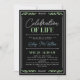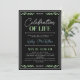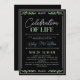 Célébration de l'invitation à la vie en noir avec verdure, un script signature bleue, et des détails verts sans photo.