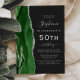 Le bord gauche de cette élégante invitation à la fête d'anniversaire moderne comporte une bordure d'agate d'aquarelle verte ornée d'une fausse parties scintillant argentée. Le texte personnalisable combine écriture gris argenté, copperplate et polices italiques sur un arrière - plan noir ardoise. L'envers présente un design d'agate vert et argenté assorti.