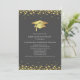 This modern design features a graduation hat and confetti in gold on a background of grey with white text.