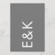 Ce superbe monogramme et emplacement de texte en Gris et Blanc, propre et bien conçu, moderne, minimal mais très ludique, pour un style minimaliste, est cependant personnalisable à d'autres couleurs et fait partie d'une suite et d'une collection uniques de Phrosne Ras Design. Ce serait génial pour ceux qui planifient un événement amusant en noir et blanc, avec ce faire-part de mariage audacieux et a été inspiré par des gens amoureux du plaisir qui aiment une bonne fête et ne se gênent pas de s'éloigner de la tradition.