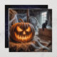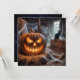 Une grosse lanterne jack-o-lanterne à l'expression menaçante brille dans une grange faiblement éclairée, remplie de balles de foin et de toiles d'or et d'un chat noir dans l'arrière - plan. Tout le texte peut être modifié.