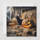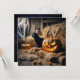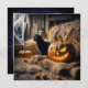 Un chat noir est assis à côté d'un citrouille sculpté brillant au visage éffrayant créant une atmosphère étrange. Tout le texte peut être modifié.