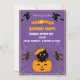 Invitacion 5x7 con disenos de unas brijitas listas para ir a la fiesta listas para divertirse, colores morado, naranja y negro.
