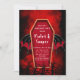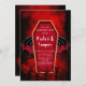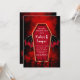 Vous aimerez ce cercueil aux ailes de chauve-souris et aux arbres éffrayants sur un arrière - plan fumé rouge et noir. Des invitations correspondantes sont disponibles.