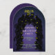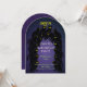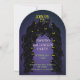 Un invitation d'Halloween violet encadré par une arcade de silhouettes de chats noirs aux yeux éffrayants brillants. Parfait pour les personnes éffrayantes, les fêtes d'enfants, etc.