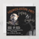 Jolie sorcière dans un grand casquette avec son chat noir sur un balai devant une lune de moisson. Avant de la carte a également deux pierres tombales mignonnes en bas à droite de la carte et un arbre mystique caché dans l'arrière - plan. Cet invitation de la fête des costumes Halloween sorcières et démonistes saura surprendre et ravir vos invités. Reverse de cette carte a la mignonne sorcière en grand casquette avec son chat noir sur une illustration de balai centré. Arrière - plan noir avec sphères grises. Les informations sur les invitations de parti, comme le mois, la date, le jour de la semaine et l'adresse, l'heure de la fête et les informations RSVP, sont entièrement personnalisables.