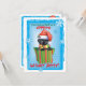 Invitation tous vos amis à une fête de Noël Doggone Great avec cette invitation montrant un mignon chiot Black Labrador Retriever portant un chapeau de Père Noël, assis dans une boîte cadeau rayée au milieu d'un tas de flocons de neige. Bonne fête de Howliday !