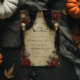 Entrez dans l'ombre grâce à ce design élégant de fête d'Halloween, qui présente des rideaux noirs dramatiques, des flancs pourpre et des accents crâniens étranges. Parfait pour accueillir une célébration d'inspiration gothique inoubliable, ce design allie sophistication et juste la bonne quantité de saveur macabre.