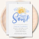 This baby shower invitation is decorated with blue watercolor clouds and a cute yellow smiling sun.
