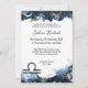 Cette invitation à la fête d'anniversaire personnalisée présente un thème d'horoscope céleste dans les tons bleu et or. Les bords supérieurs et inférieurs sont dotés d'un motif céleste de ciel nocturne aux accents dorés et d'une lune en croissant. Un symbole d'horoscope Libra est imprimé en bas à gauche à côté de l'information de la fête.