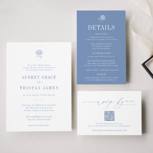 HYDRANGEA, wedding invitation. Template features, trendy blue typography with hydrangea floral stem illustration.