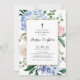 Famille Invitation et amis à votre événement avec cette élégante invitation à baptiser à la floraison. Il présente des illustrations d'aquarelle d'hydrangées bleues, de roses roses roses rousses, d'eucalyptus et de verdure avec cadre faux doré. Personnalisez en ajoutant des détails sur l'événement, le nom, l'heure, la date, le lieu et d'autres détails sur l'événement. Vous pouvez également modifier l'image arrière en une photo ou toute autre image. Cette invitation à la floraison est parfaite pour les baptêmes de jardin et de printemps.