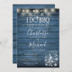 De jolis lampes à cordes et des jarres de maçon décorent vos détails spéciaux de fête de fiançailles, dans une élégante typographie sur un arrière - plan en bois rustique bleu. Conçu par Thisisnotme©