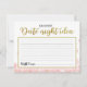 Cette carte florale moderne "Date Night Idea" présente un arrière - plan rose aux éclats de parties scintillant dorée. Le texte est écrit dans un mélange d'une police calligraphie ludique et d'une police sans police moderne, cette carte Date Night Idea est personnalisée avec le nom de la mariée à devenir et la date de Fête des mariées.