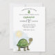 Cette invitation de fête personnalisée présente une illustration de bébé tortue mignonne. Une petite tortue verte est placée en bas à gauche avec un soleil brillant au-dessus. C'est idéal pour une fête prénatale ou un anniversaire d'enfant. Le nom et l'âge exemple sont imprimés dans une police verte.