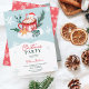 Illustration moderne, mignonne et fantaisiste d'une fête de Noël avec un mignon bonhomme de neige flottant dans une tasse de chocolat chaud tenant un sucre de canne rouge et blanc avec des arbres de Noël blancs et rouges et de la neige sur la tasse avec un joli cadeau habillé bleu sur une pile de neige avec un biscuit beige étoile d'or. Un invitation traditionnel de Noël rouge et vert avec une police de script brossé joueuse. Toutes les couleurs sont modifiables.