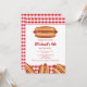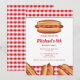 L'illustration de restauration rapide de Destei représentant un pain à hot dog avec une saucisse grillée surmontée de ketchup et de moutarde. Le fond présente un motif à carreaux rouges. Personnalisez le texte avec les détails de votre événement.