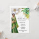 Une belle aquarelle d'une mariée indienne portant une robe de mariée sari verte et or avec des parures décoratives en or et un long voile. Elle est debout sous une seule fleur blanche et une seule fleur verte en pleine floraison dressée contre un arrière - plan blanc. Script de calligraphie noire et modèles noirs de style romain apparaissent à sa droite pour votre libellé personnalisé. Ce design est idéal pour les douches nuptiales élégantes, simples, fleuries ou botaniques rouges et or. N'hésitez pas à changer la couleur de l'arrière - plan et de la police en n'importe quelle couleur de votre choix pour convenir à votre occasion spéciale.