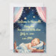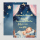 Accueillez votre bébé garçon avec cette invitation paisible et rêveuse ! Avec un nouveau-né endormi reposant sous une douce nuit étoilée, encadré de rideaux légers et d'un berceau douillet. Parfait pour les fêtes prénatales, les faire-part de naissance ou les soirées de bienvenue. Entièrement personnalisable avec les détails de votre bébé.